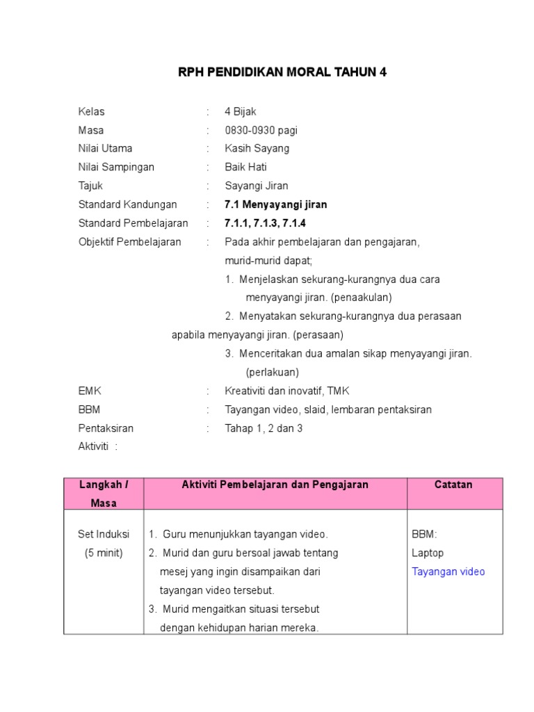 Doc Rancangan Pengajaran Harian Pendidikan Moral Tahun 4 Cikgu Mor Academia Edu